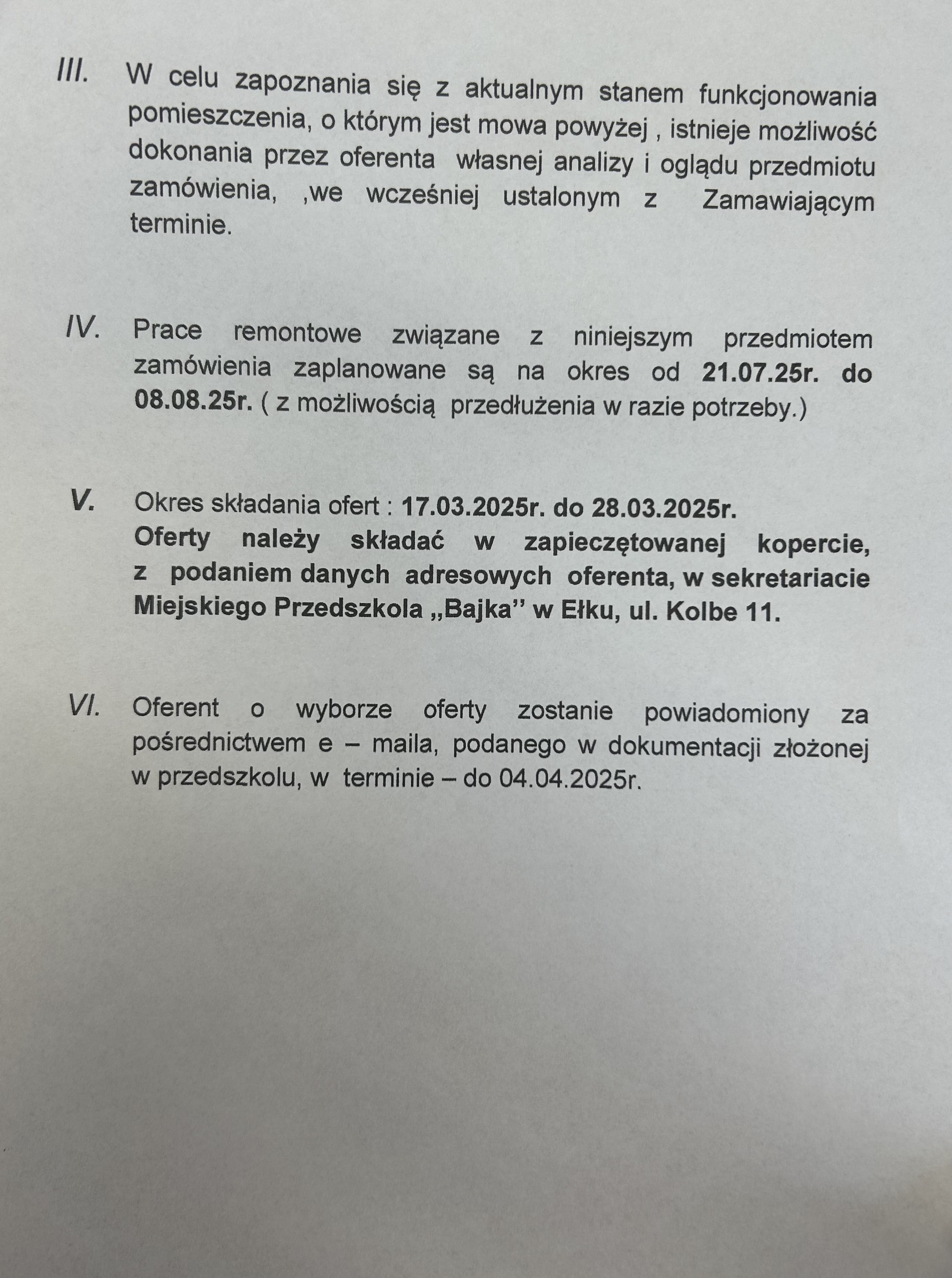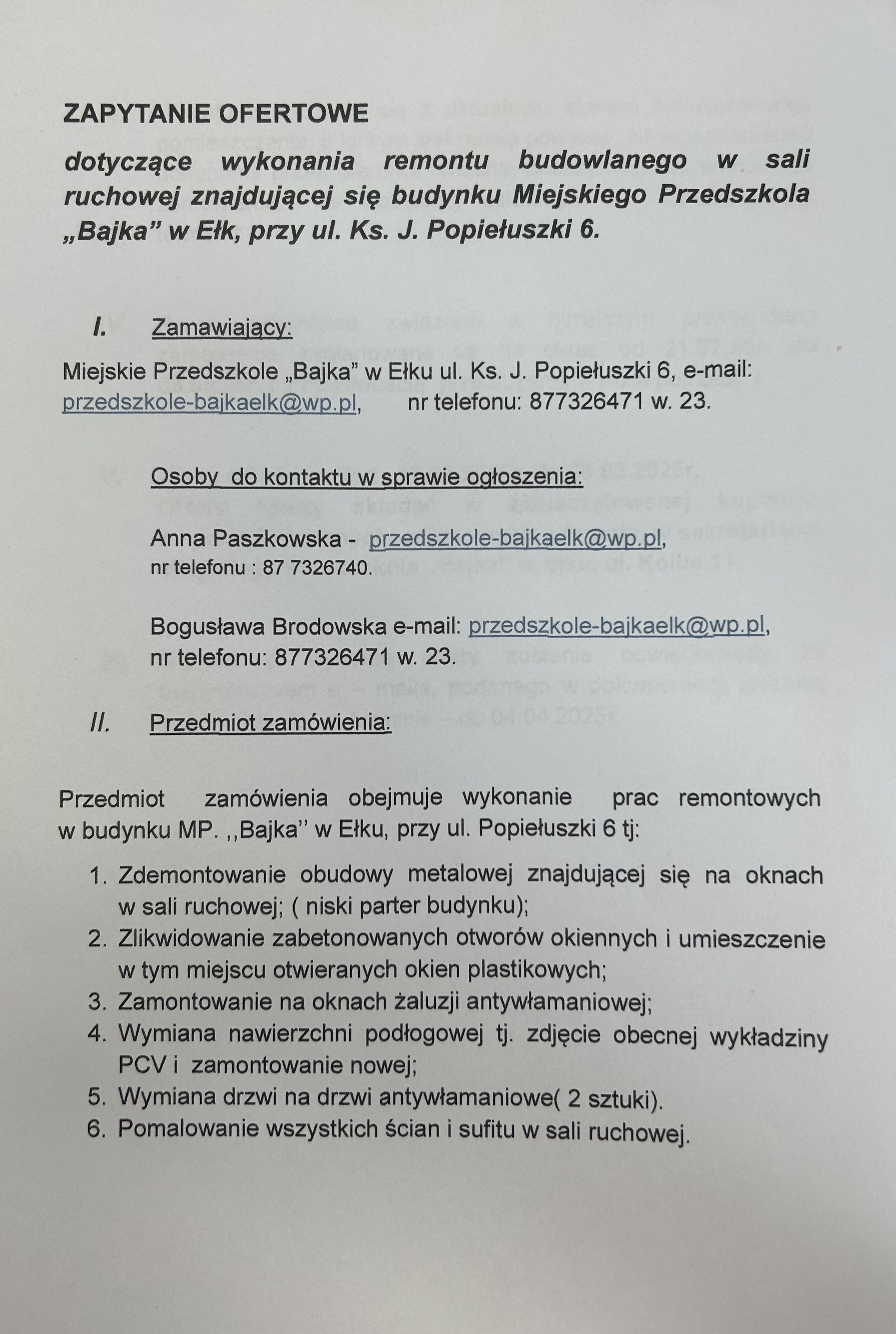 Zapytanie dotyczące wykonania remontu budowlanego w sali ruchowej znajdującej się w budynku MP "Bajka" w Ełku, przy ul. Ks. J. Popiełuszki 6.Zapytanie dotyczące wykonania remontu budowlanego w sali ruchowej znajdującej się w budynku MP "Bajka" w Ełku, przy ul. Ks. J. Popiełuszki 6.